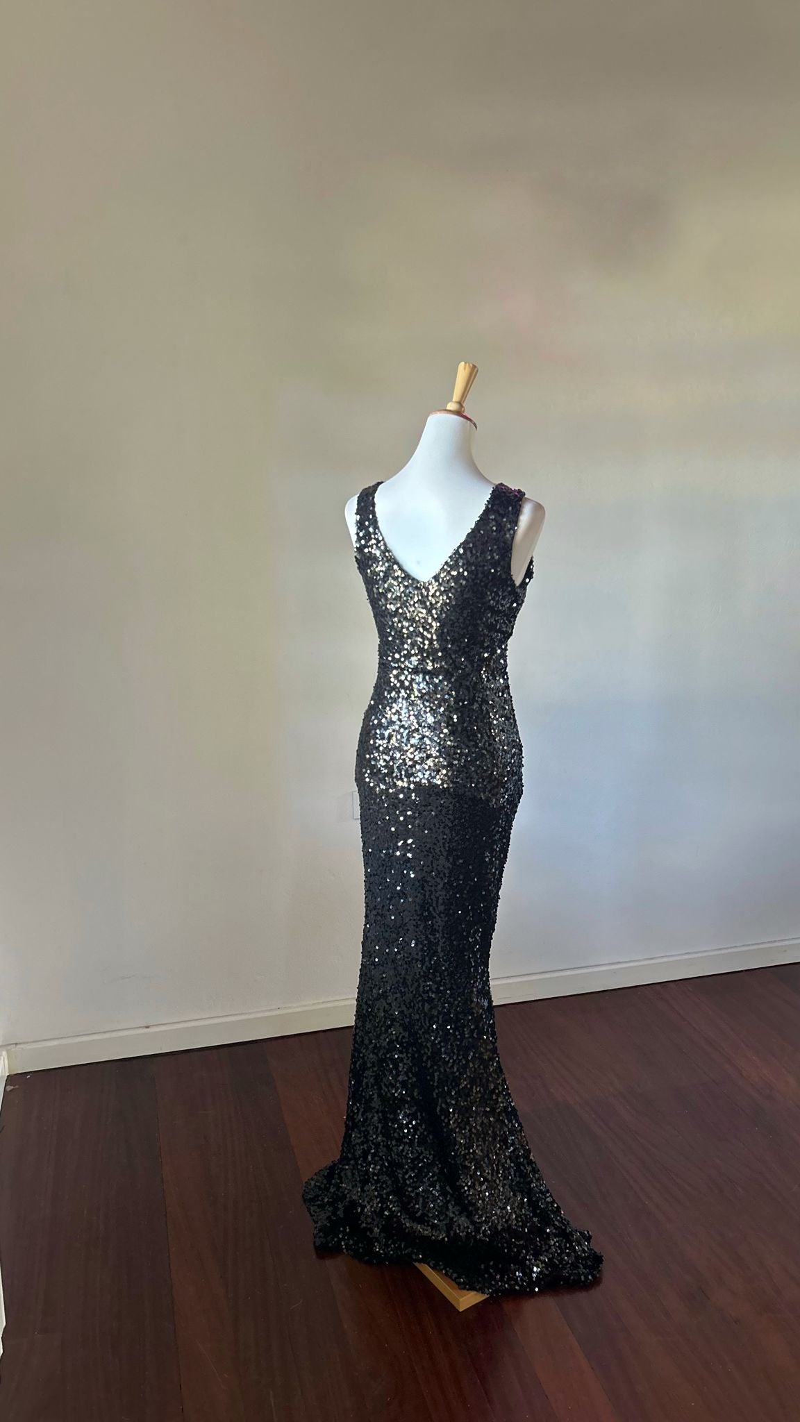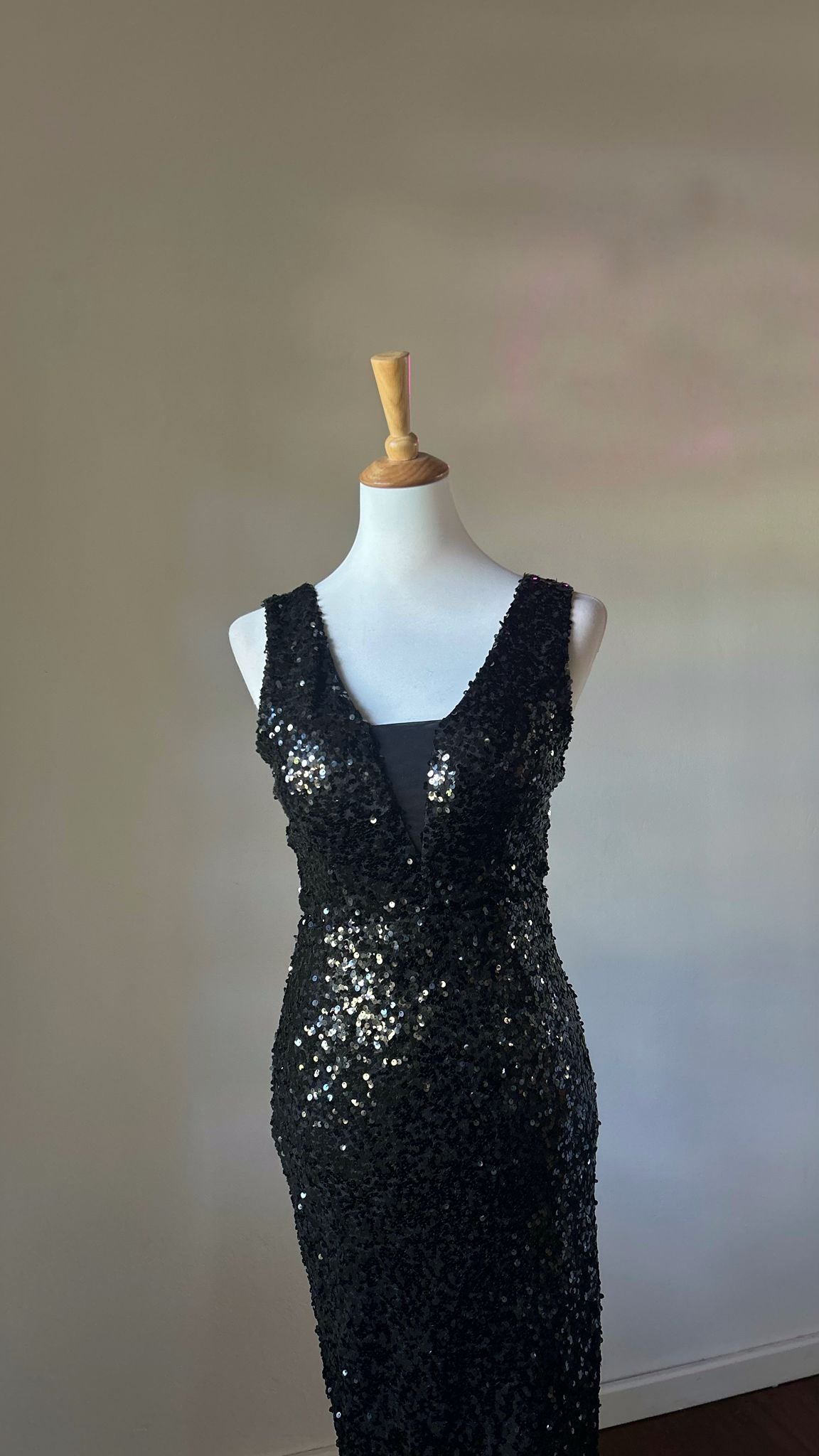 Abito interamente in paillettes con scollo a V, senza spacchi.
