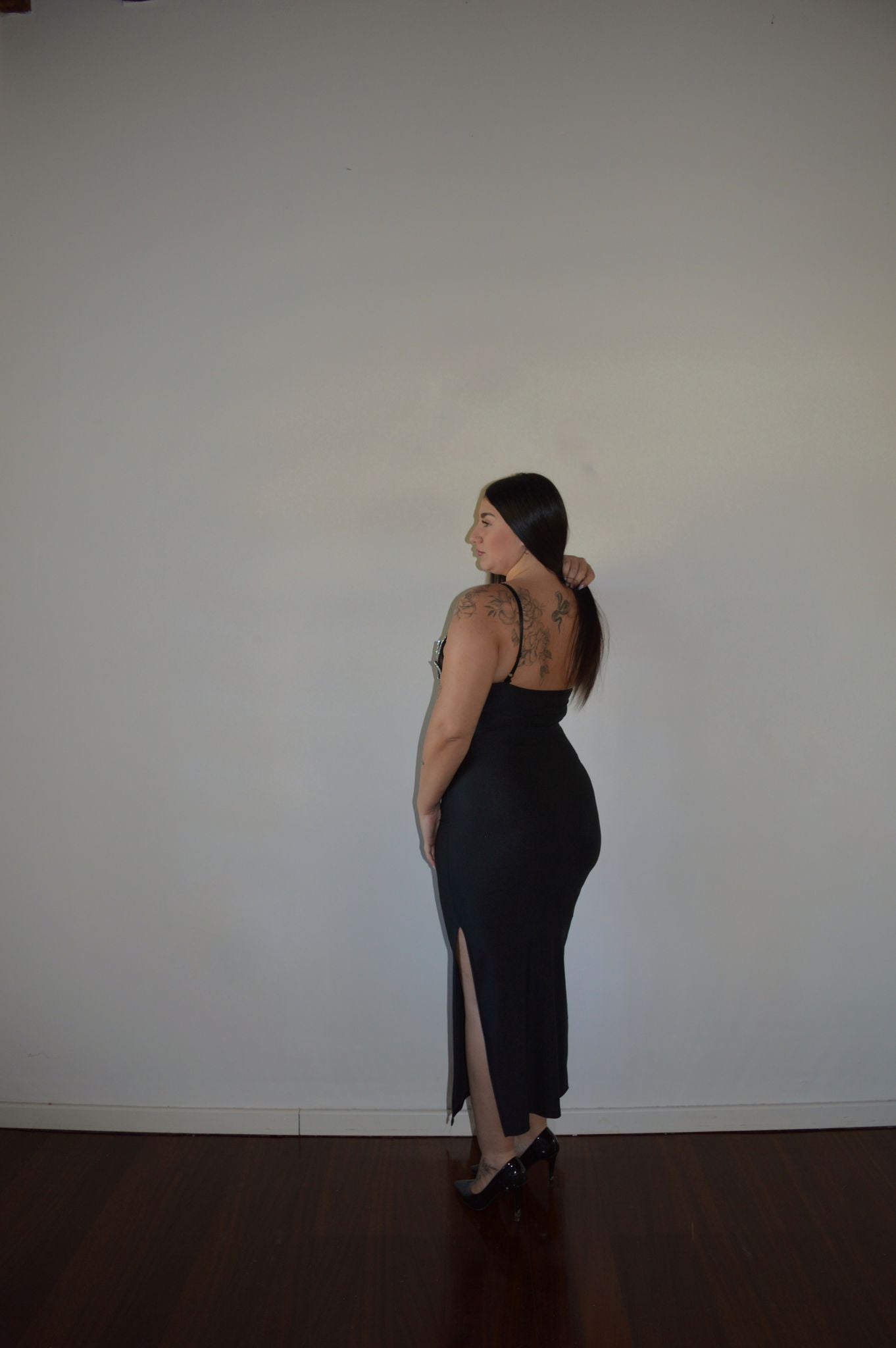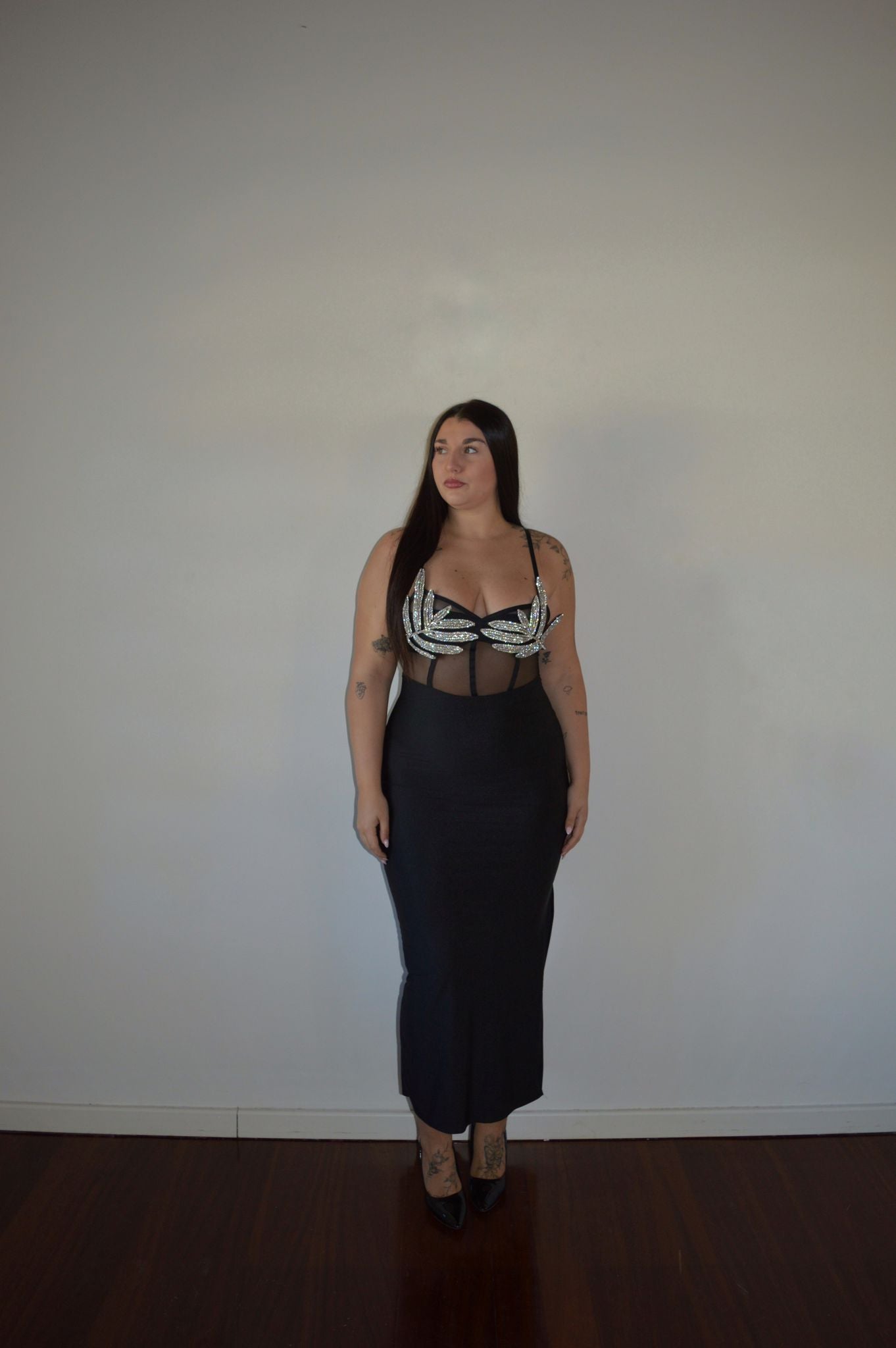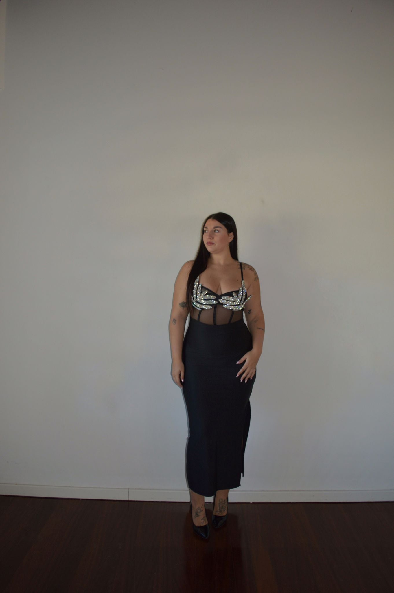 Abito con foglie swarovski sulle coppe, spalline regolabili.