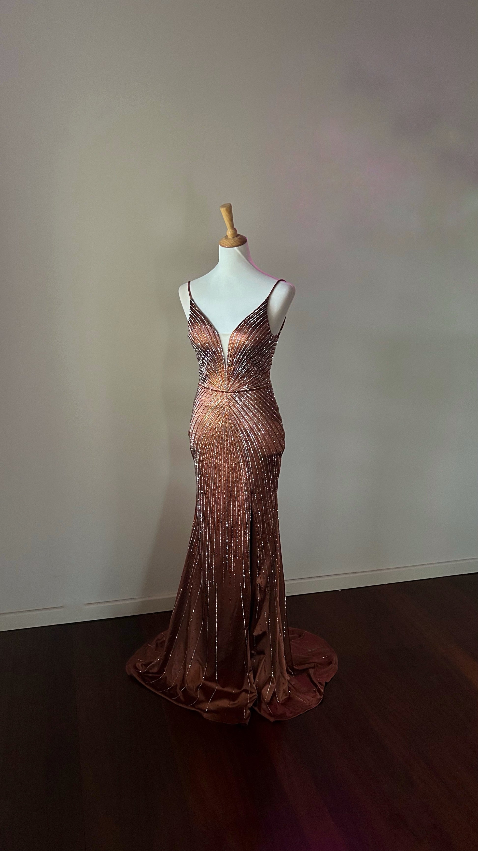 Abito lungo con spacco, completamente rivestito da swarovski.
