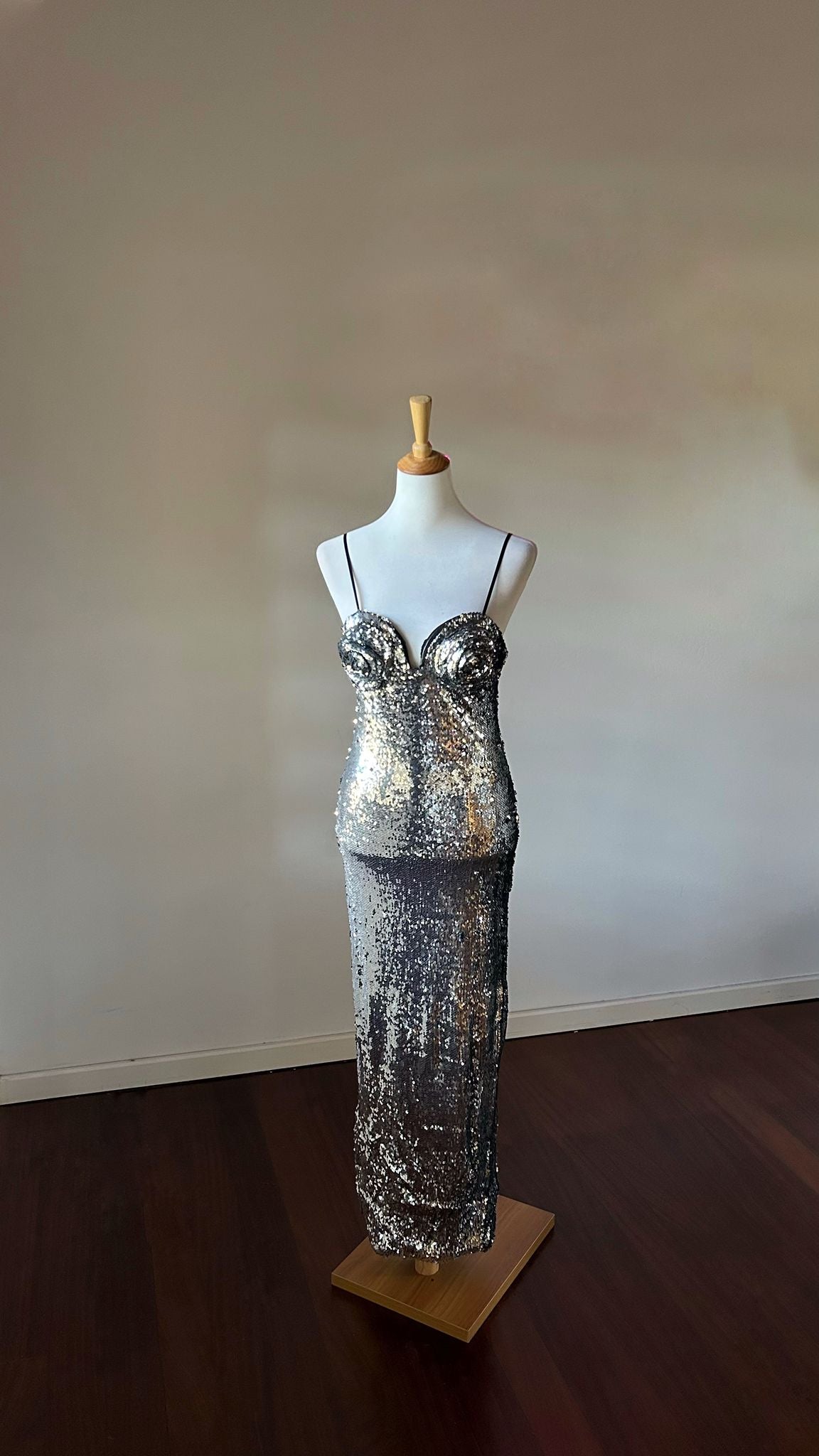 Abito interamente in paillettes con il dettaglio delle rose sul seno.